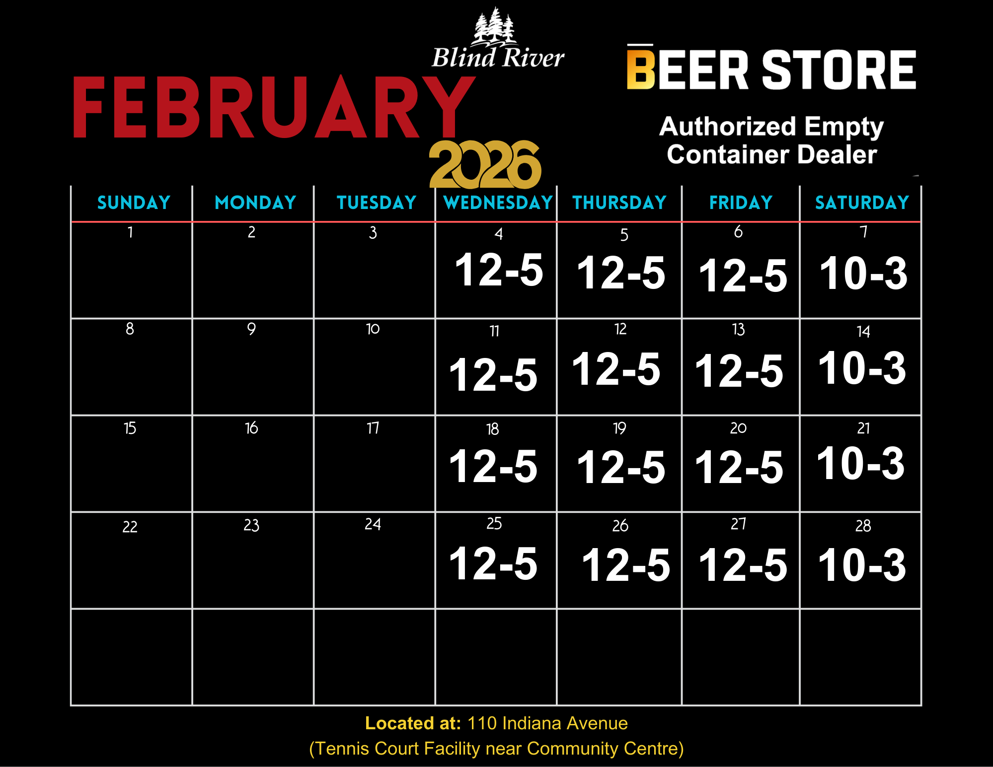 *The Beer Store Repository is located at 110 Indiana, beside the Tennis/Pickleball Courts near Community Centre.