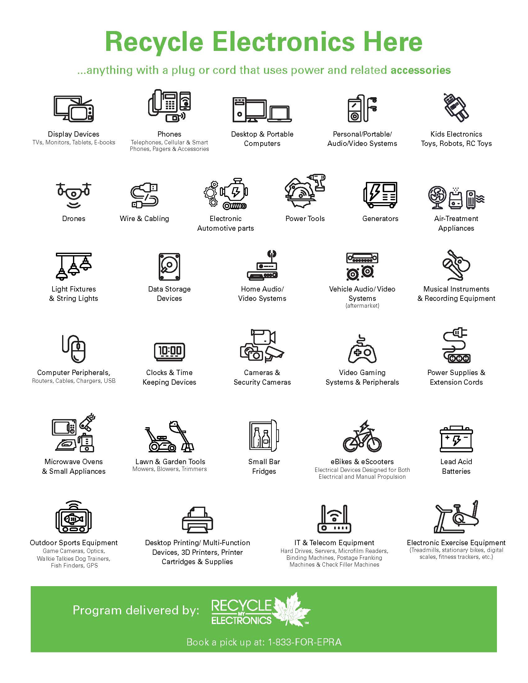 Electronics should never be put in the Blue Bin (recycling) or garbage. The Town of Blind River collects unwanted electronics for free to ensure they are disposed of safely, recycled and kept out of landfill. E-waste can be disposed of at no cost at the Blind River Landfill. There is a sea container designated for disposal of this waste stream. See below to determine if your waste is accepted.